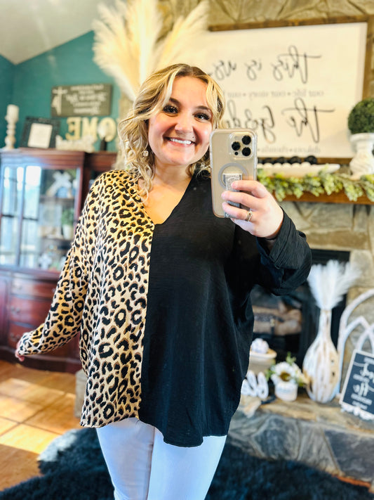 Jodifl Leopard Print Colorblock Long Sleeve Top