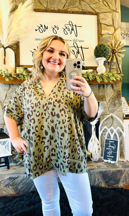 Jodifl Sage Leopard Print Boxy Vneck Short Sleeve Top