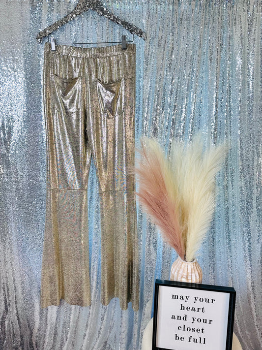 Gold Flare Pants With Pockets