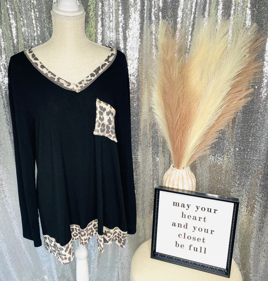 Black Long Sleeve Leopard Border Flowy Pocket Top