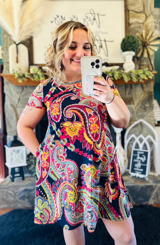 Navy Paisley Floral Dress With Pockets