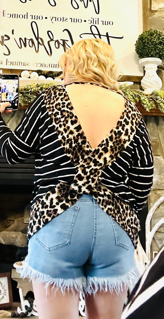 Long Sleeve Striped Cheetah Criss Cross Open Back Top