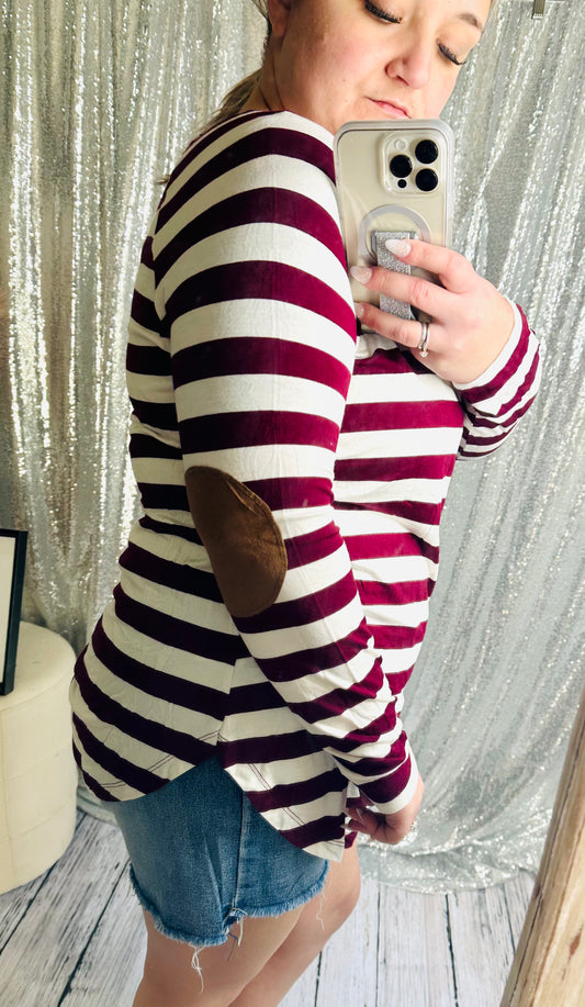 Zenana - Burgundy Striped Long Sleeve Patch Elbow Top