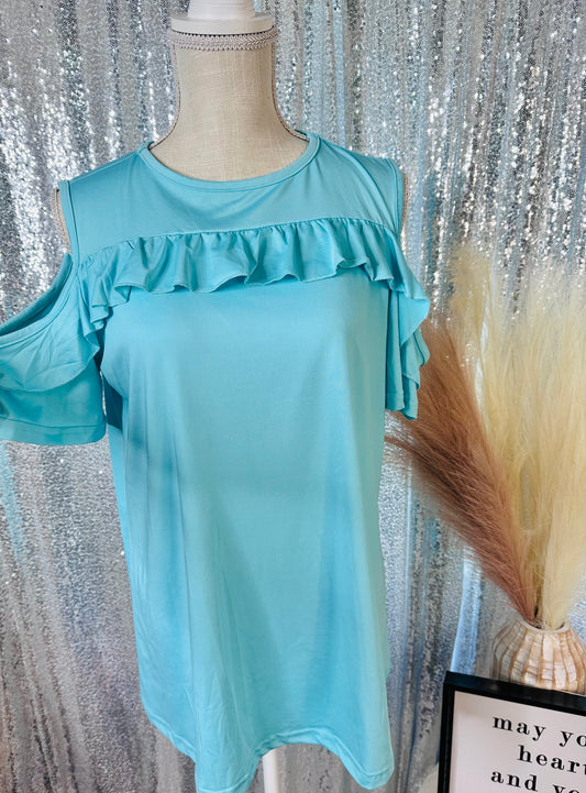 Teal Flowy Open Shoulder Ruffle Top