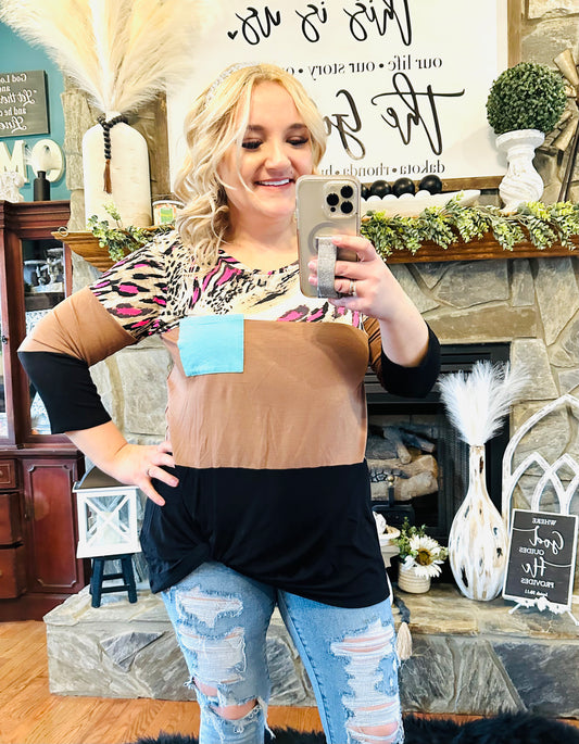 Cheetah / Brown / Black Block Quarter Sleeve Pocket Top