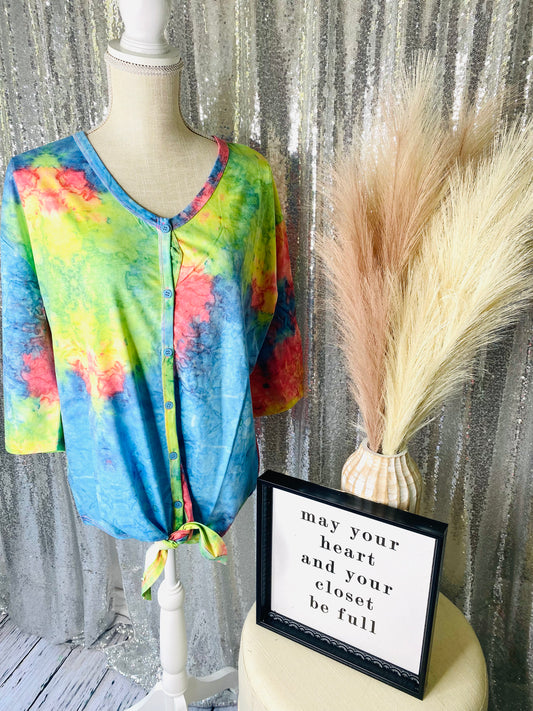 Lucky & Blessed - Tie Die Quarter Sleeve Button Down Knot Tie Top
