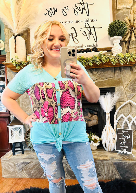 Teal / Snake Block Button Down Knot Tie Top